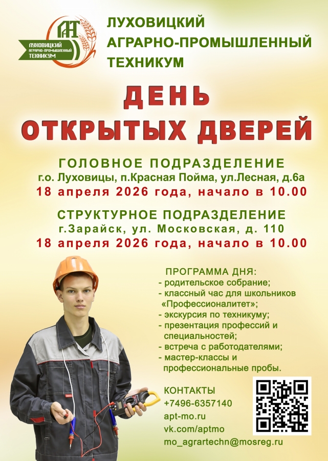 10 и 18 апреля 2026 года в Луховицком аграрно-промышленном техникуме состоится День открытых дверей в том числе в рамках Федерального проекта «Профессионалитет» национального проекта «Молодежь и дети»!