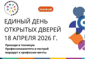 Приглашаем школьников и родителей 18 апреля 2026 года с 10.00 часов на Единый День Открытых Дверей федерального проекта «Пофессионалитет» в наш техникум! В программе дня: